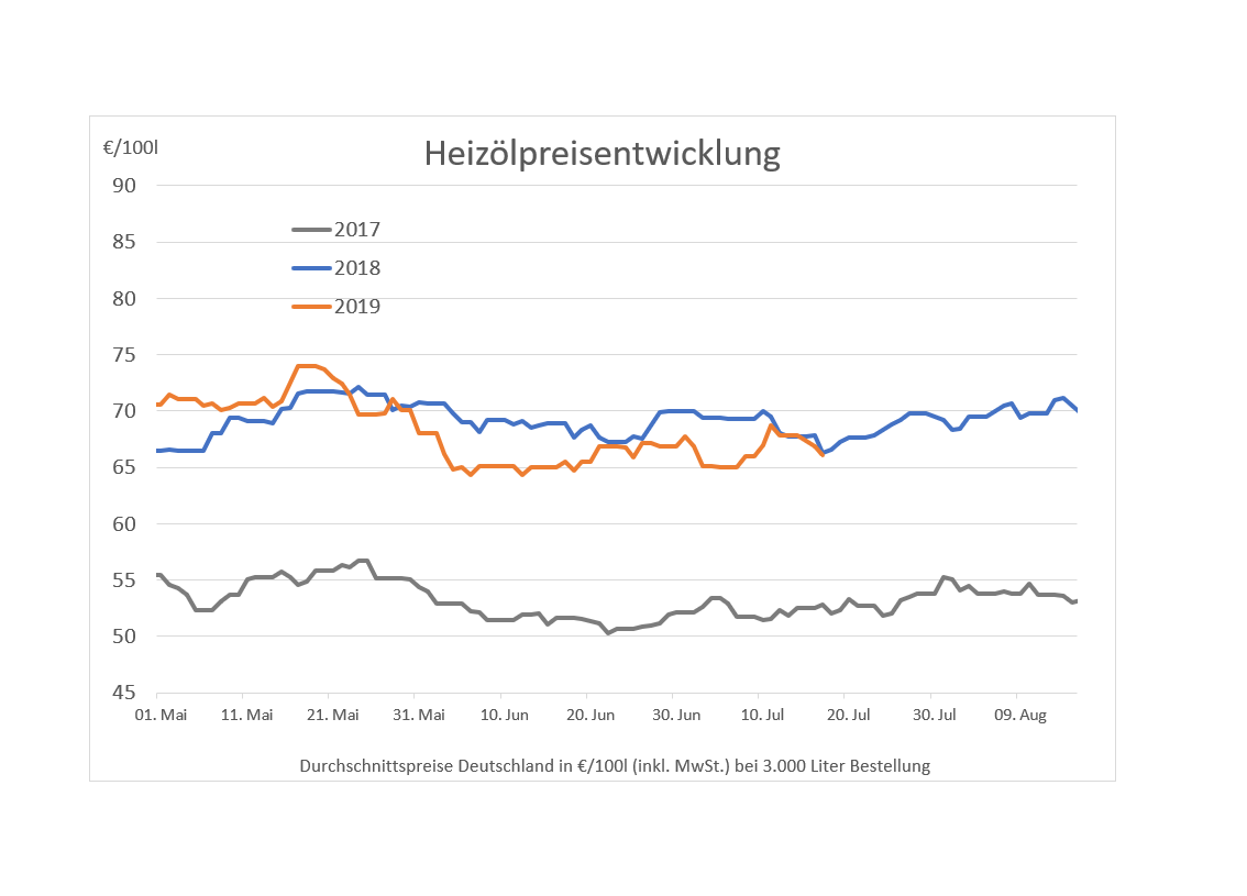 Hinweis: Die genannten Heizölpreise beziehen sich stets auf den deutschlandweiten Durchschnittspreis bei einer Bestellung von 3.000 Liter Heizöl Standard schwefelarm inklusive 19% MwSt.. Durch Transportkosten fallen die Preise regional jedoch unterschiedlich aus. Die Preisspanne zwischen den Regionen kann daher momentan bei bis zu ca. 3,33 Euro pro 100 Liter liegen. Stand der Preise: 18.07.2019