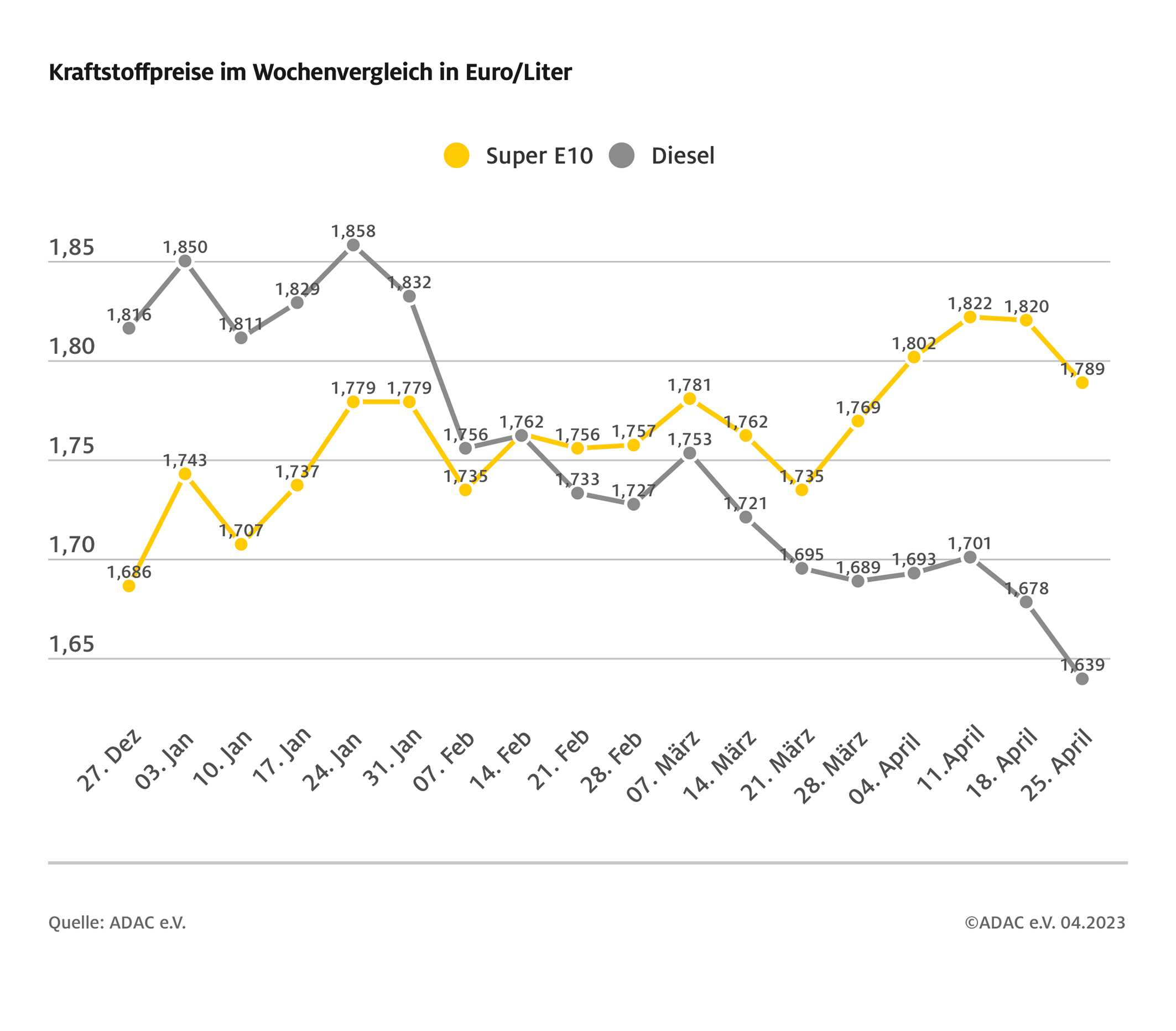München (ots) – Die Kraftstoffpreise an den deutschen Tankstellen sind im Vergleich zur Vorwoche spürbar gesunken – das zeigt die aktuelle ADAC Auswertung. Danach kostet ein Liter Super E10 im bundesweiten Mittel 1,789 Euro und damit 3,1 Cent weniger als vor einer Woche. Noch klarer ist der Preisrückgang bei Diesel: Für einen Liter müssen die Autofahrer derzeit im Schnitt 1,639 Euro bezahlen, das ist ein Minus von 3,9 Cent.