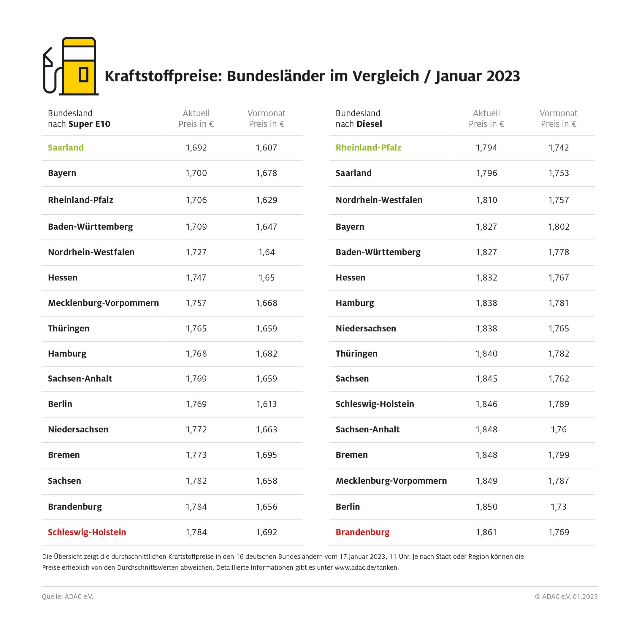 München (ots) – Noch im Spätsommer und Herbst 2022 hat der ADAC in seinem Vergleich der Kraftstoffpreise in den deutschen Bundesländern regionale Preisdifferenzen von rund 17 Cent festgestellt. Dies scheint der Vergangenheit anzugehören – die Preisunterschiede sind wieder auf ein weitaus geringeres Maß geschrumpft aber immer noch erheblich. Wie die aktuelle Auswertung in den 16 Bundesländern zeigt, tanken die Autofahrer im Saarland und in Rheinland-Pfalz am günstigsten, in Schleswig-Holstein und in Brandenburg ist Kraftstoff derzeit am teuersten.