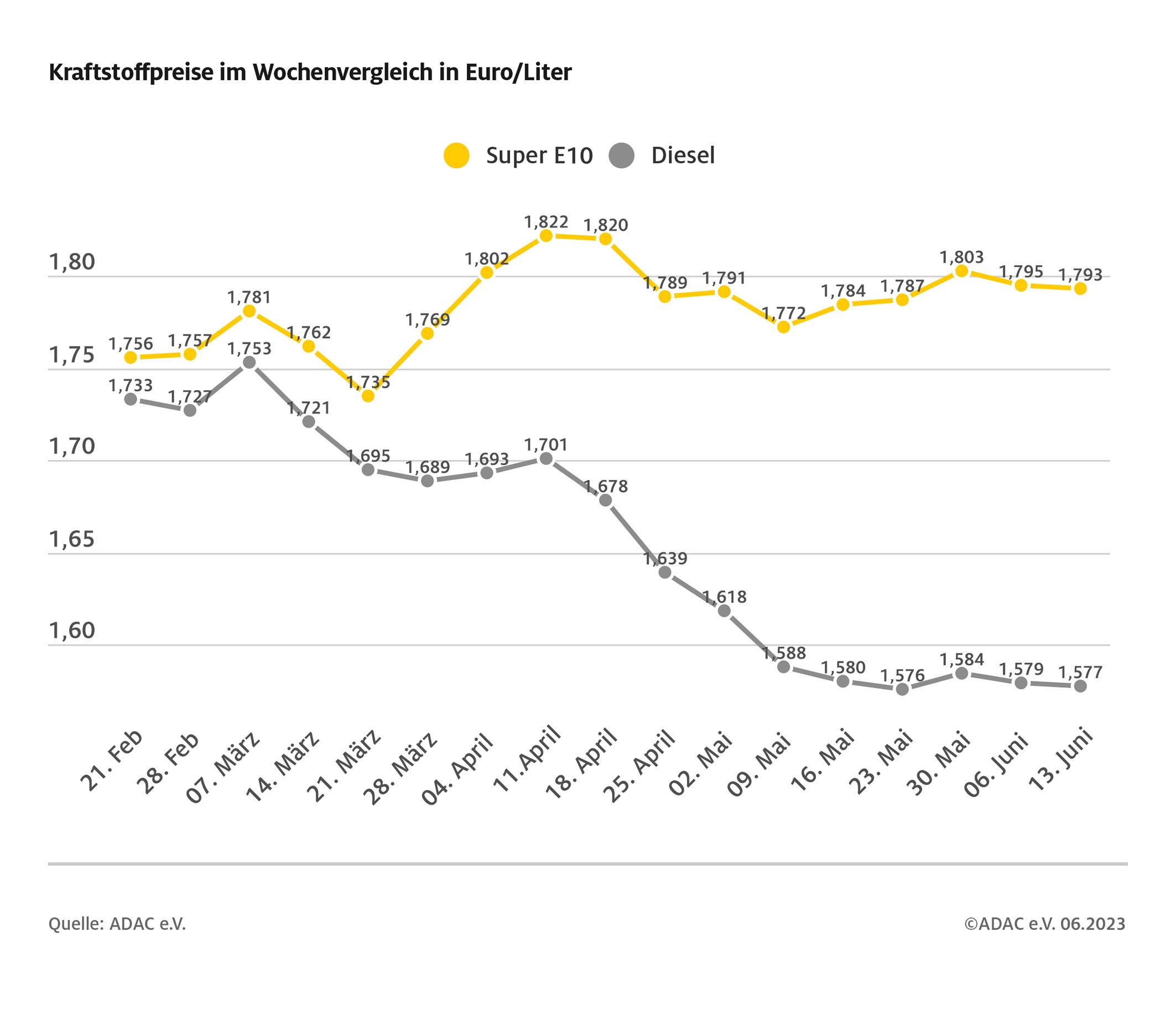 München (ots) – Die Preise an den Zapfsäulen in Deutschland sind im Vergleich zur vergangenen Woche leicht gesunken. Laut aktueller ADAC Auswertung der Kraftstoffpreise kostet ein Liter Super E10 im bundesweiten Mittel 1,793 Euro, das sind 0,2 Cent weniger als in der Vorwoche. Diesel ist ebenfalls um 0,2 Cent billiger und kostet aktuell 1,577 Euro.