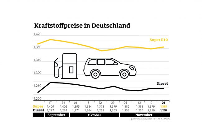 München (ots) Autofahrer mussten im November für Benzin und Diesel im Bundesmittel etwas weniger als im Oktober bezahlen. Laut der monatlichen Marktauswertung des ADAC kostete ein Liter Super E10 im Bundesdurchschnitt 1,383 Euro, das sind 0,1 Cent weniger als im Vormonat. Diesel verbilligte sich gegenüber dem Oktober um 0,6 Cent auf durchschnittlich 1,257 Euro je Liter.…