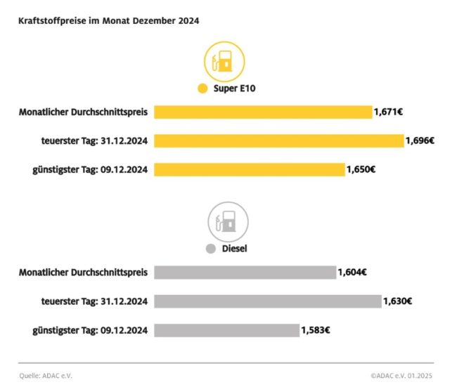 ADAC: Tanken in der ersten Januarwoche deutlich teurer – Preis für Super E10 steigt gegenüber Vorwoche um 3,5 Cent, Diesel um 3,3 Cent – Ursache sind höhere CO2-Abgabe und gestiegener Rohölpreis
