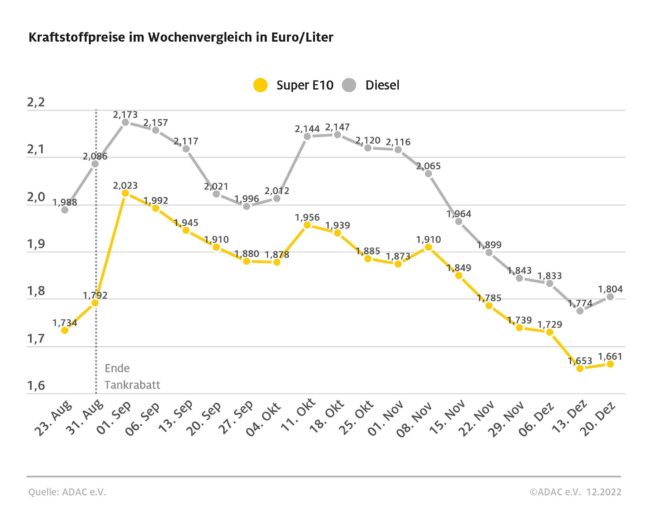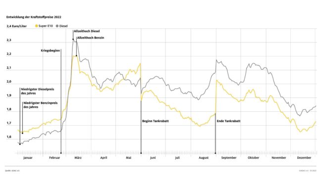 2022 – Teuerstes Tankjahr aller Zeiten – Diesel ist im Jahresdurchschnitt erstmals teurer als Super E10 – Preise im Dezember zeigen leichte Entspannung