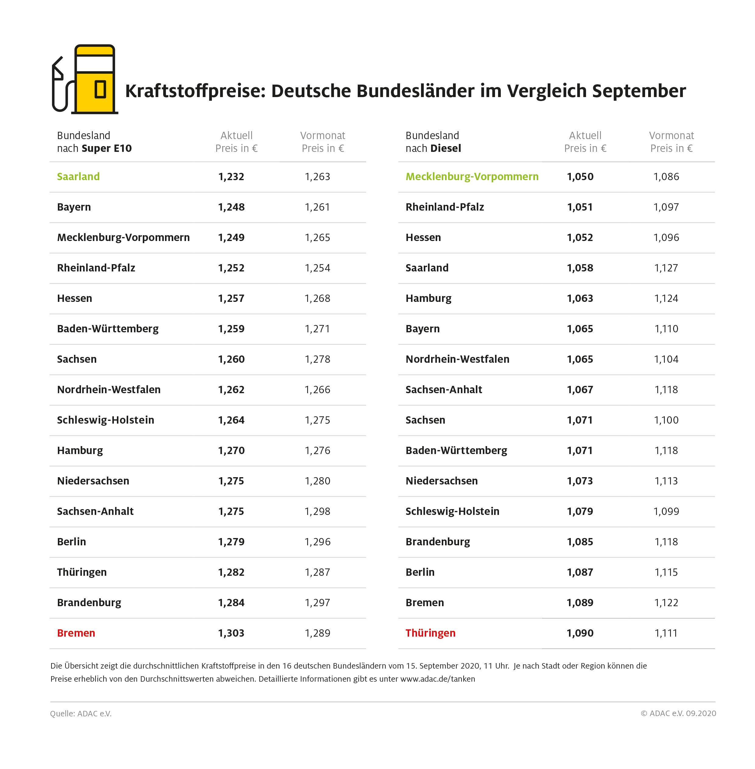 Diesel ist mit durchschnittlich 1,050 Euro je Liter in Mecklenburg-Vorpommern am günstigsten. In Thüringen, dem teuersten Bundesland, müssen Autofahrer mit 1,090 Euro je Liter 4,0 Cent mehr bezahlen. Auffällig ist, dass man im Stadtstaat Bremen besonders teuer tankt. Auch Diesel ist hier mit durchschnittlich 1,089 Euro je Liter nur unwesentlich billiger als in Thüringen. Traditionell sind die Kraftstoffpreise in Stadtstaaten eher günstig.