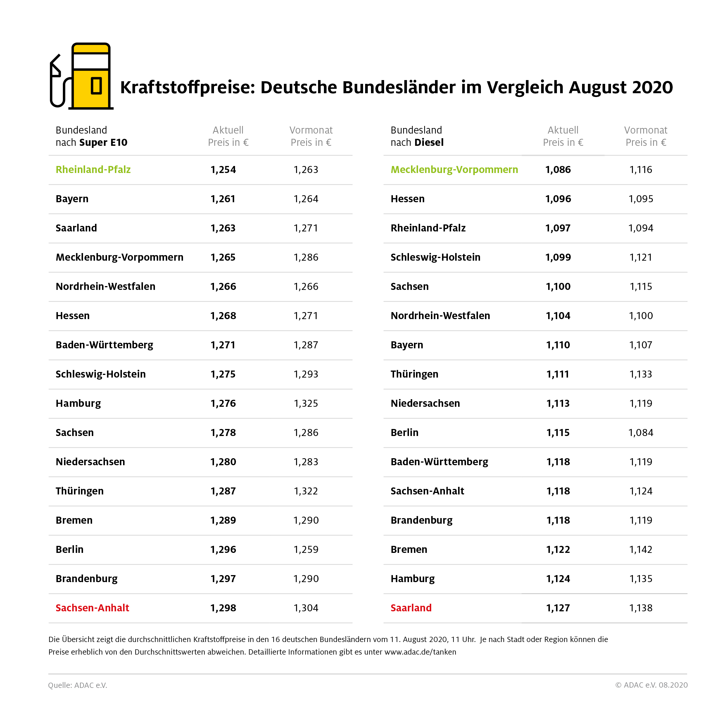 München (ots) – Die regionalen Unterschiede bei den Kraftstoffpreisen in Deutschland haben sich verringert. Dies zeigt der aktuelle Bundesländervergleich des ADAC. Benzin ist derzeit in Rheinland-Pfalz am günstigsten. Dort kostet ein Liter Super E10 durchschnittlich 1,254 Euro und damit 4,4 Cent weniger als in Sachsen-Anhalt, wo Super E10 am teuersten ist.