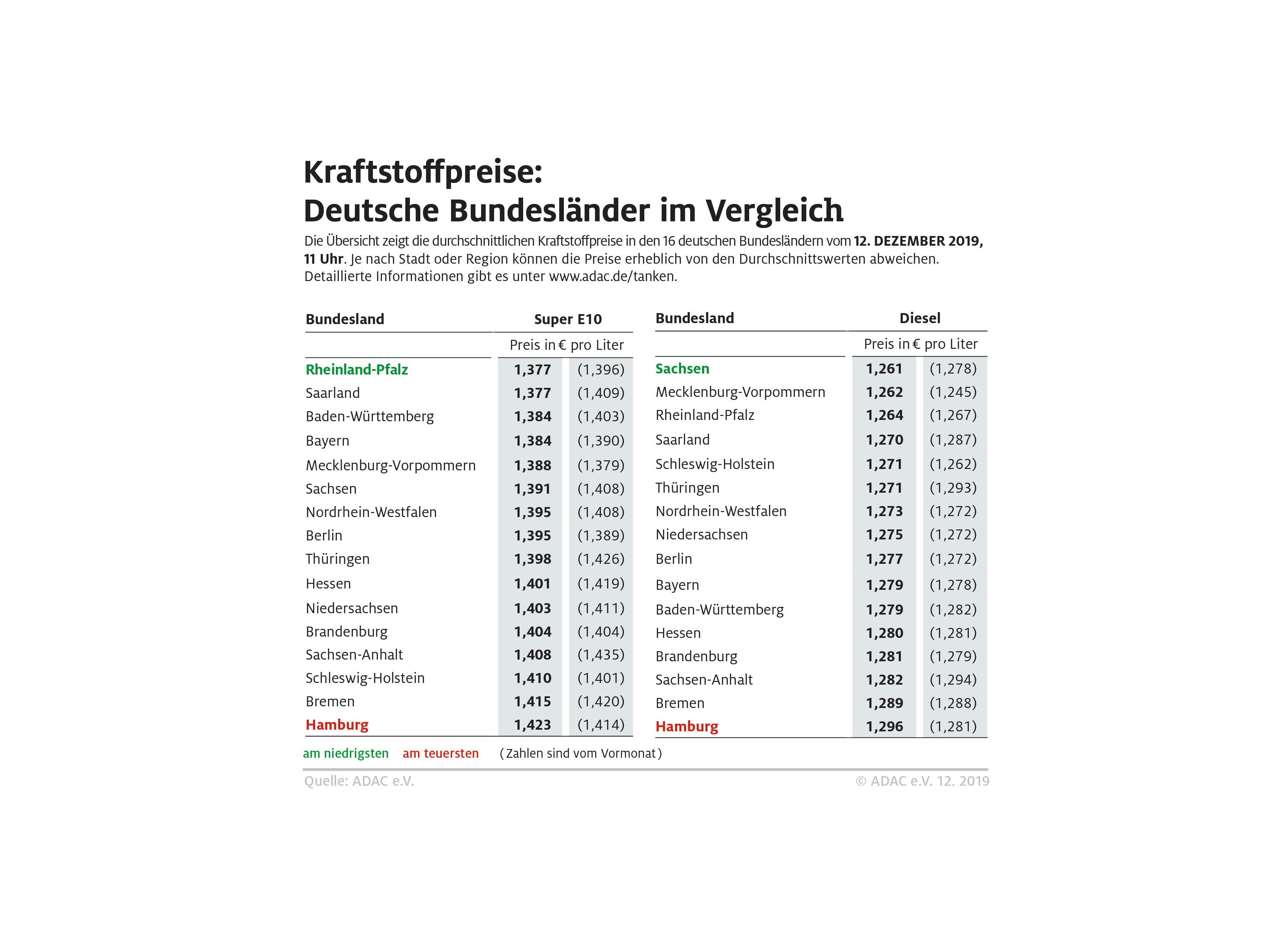 Etwas anders zeigt sich das Bild bei Diesel: Mit durchschnittlich 1,261 Euro je Liter ist Sachsen am preiswertesten. Schlusslicht ist auch beim Diesel Hamburg, wo der Liter im Mittel 1,296 Euro, und damit 3,5 Cent mehr als in Sachsen kostet.