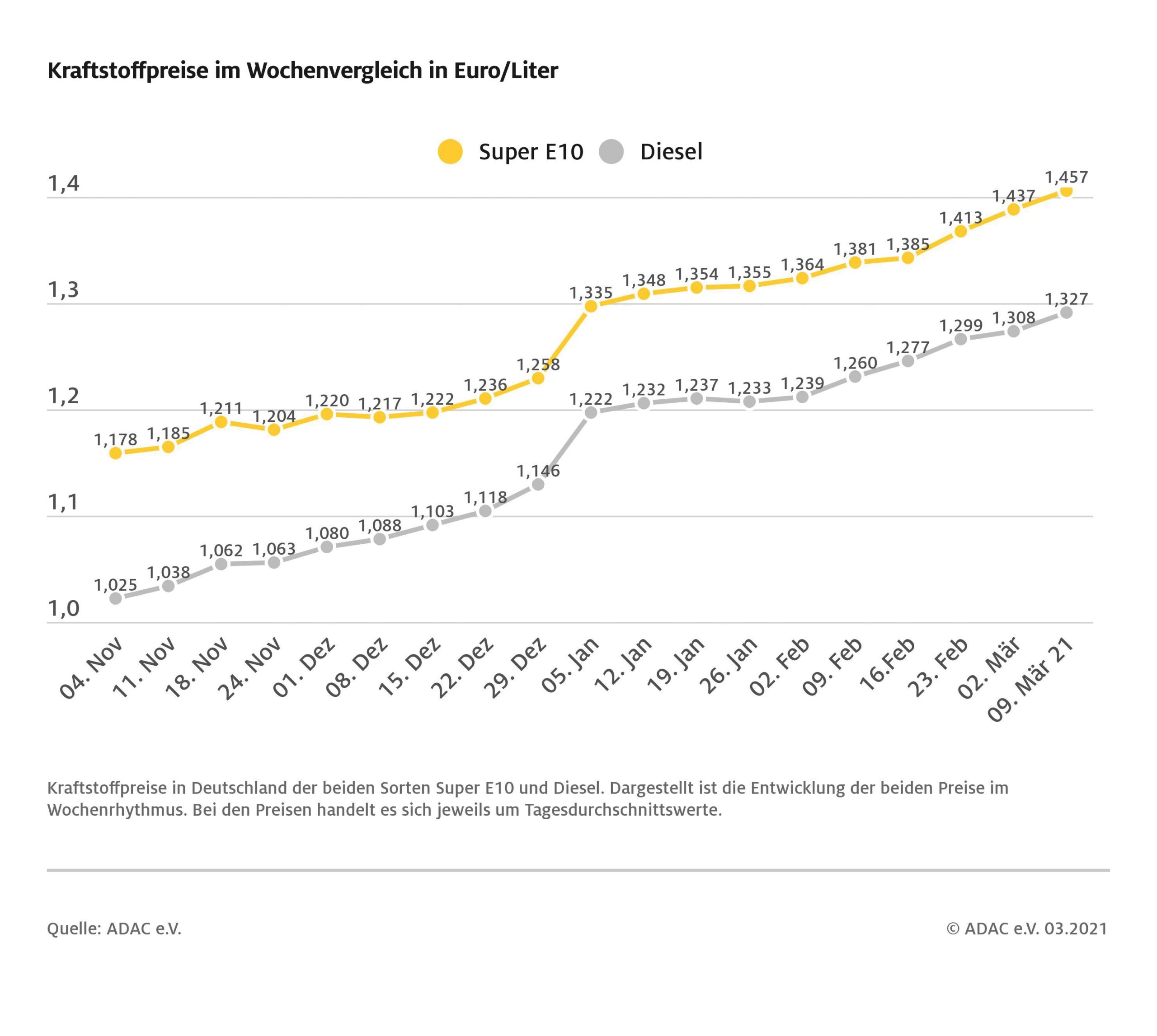 Der Benzinpreis kennt seit Wochen nur eine Richtung – nach oben. Wie die wöchentliche ADAC Auswertung der Kraftstoffpreise zeigt, hat sich der Ottokraftstoff zum 13. Mal in Folge gegenüber der Vorwoche verteuert. Ein Liter Super E10 kostet demnach 1,457 Euro im bundesweiten Mittel und ist damit um zwei Cent als teurer vor Wochenfrist.