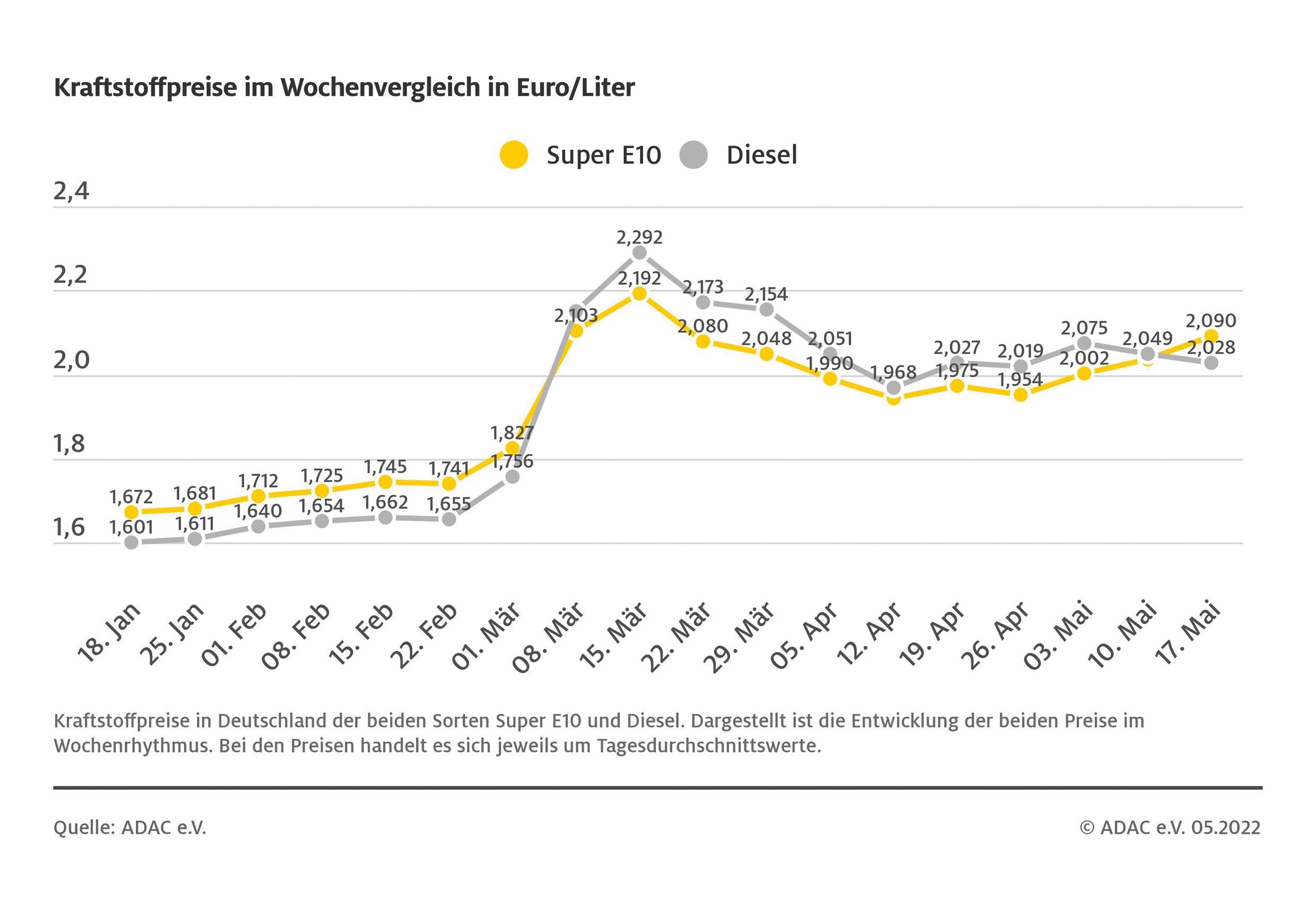 München (ots) – Benzin ist im Vergleich zur Vorwoche deutlich teurer geworden. Wie die aktuelle ADAC Auswertung der Kraftstoffpreise in Deutschland zeigt, kostet ein Liter Super E10 im bundesweiten Mittel derzeit 2,090 Euro. Damit hat sich Benzin binnen einer Woche um 5,4 Cent verteuert. Leichte Entspannung zeigt sich hingegen bei Diesel-Kraftstoff: Für einen Liter müssen die Autofahrer aktuell 2,028 Euro bezahlen und damit 2,1 Cent weniger.