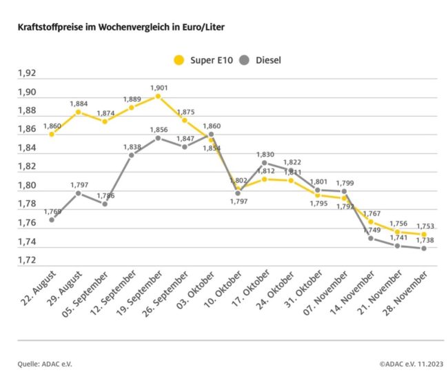 ADAC: Tanken im November erneut günstiger – Benzin 4,4 Cent billiger als im Oktober, Diesel 5,9 Cent – 2023 wird dennoch zweitteuerstes Tankjahr aller Zeiten