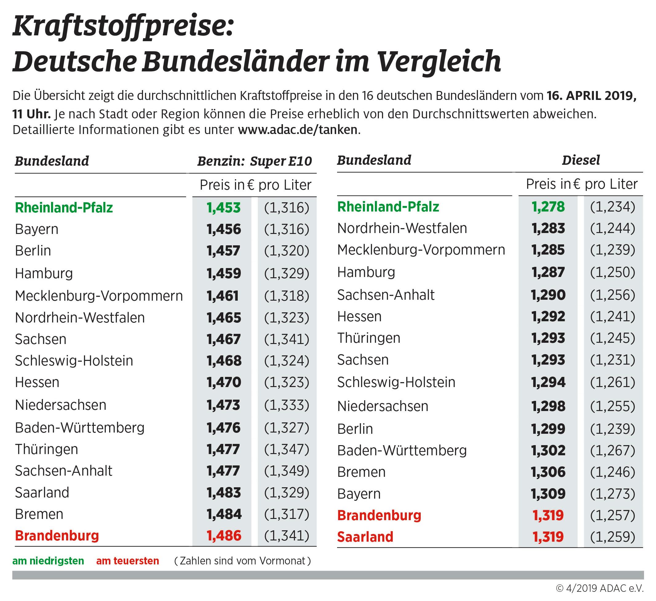Die Durchschnittspreise für Benzin und Diesel in den Bundesländern weisen vergleichsweise geringe Unterschiede auf. Am günstigsten tanken Autofahrer derzeit in Rheinland-Pfalz: Ein Liter Super E10 ist hier mit durchschnittlich 1,453 Euro um 3,3 Cent billiger als im teuersten Bundesland Brandenburg (1,486 Euro). Ein Liter Diesel kostet in Rheinland-Pfalz im Mittel 1,278 Euro, immerhin 4,1 Cent weniger als im benachbarten Saarland, wo Autofahrer – ebenso wie in Brandenburg – mit 1,319 Euro am meisten bezahlen müssen.