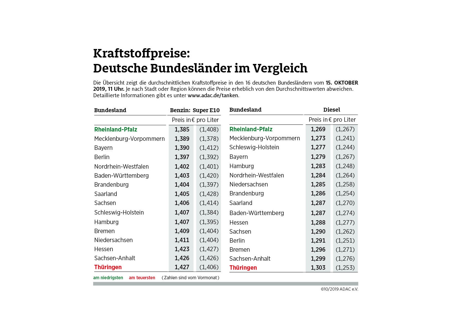 Am günstigsten tanken derzeit die Autofahrer in Rheinland-Pfalz. Hier kostet ein Liter Super E 10 1,385 Euro und ein Liter Diesel 1,269 Euro. Um jeweils 0,4 Cent teurer sind Benzin und Diesel in Mecklenburg-Vorpommern, dem zweitgünstigsten Bundesland. Damit beträgt die Preisspanne zwischen günstigstem und teuerstem Bundesland derzeit 4,2 Cent bei Benzin und 3,4 Cent bei Diesel.