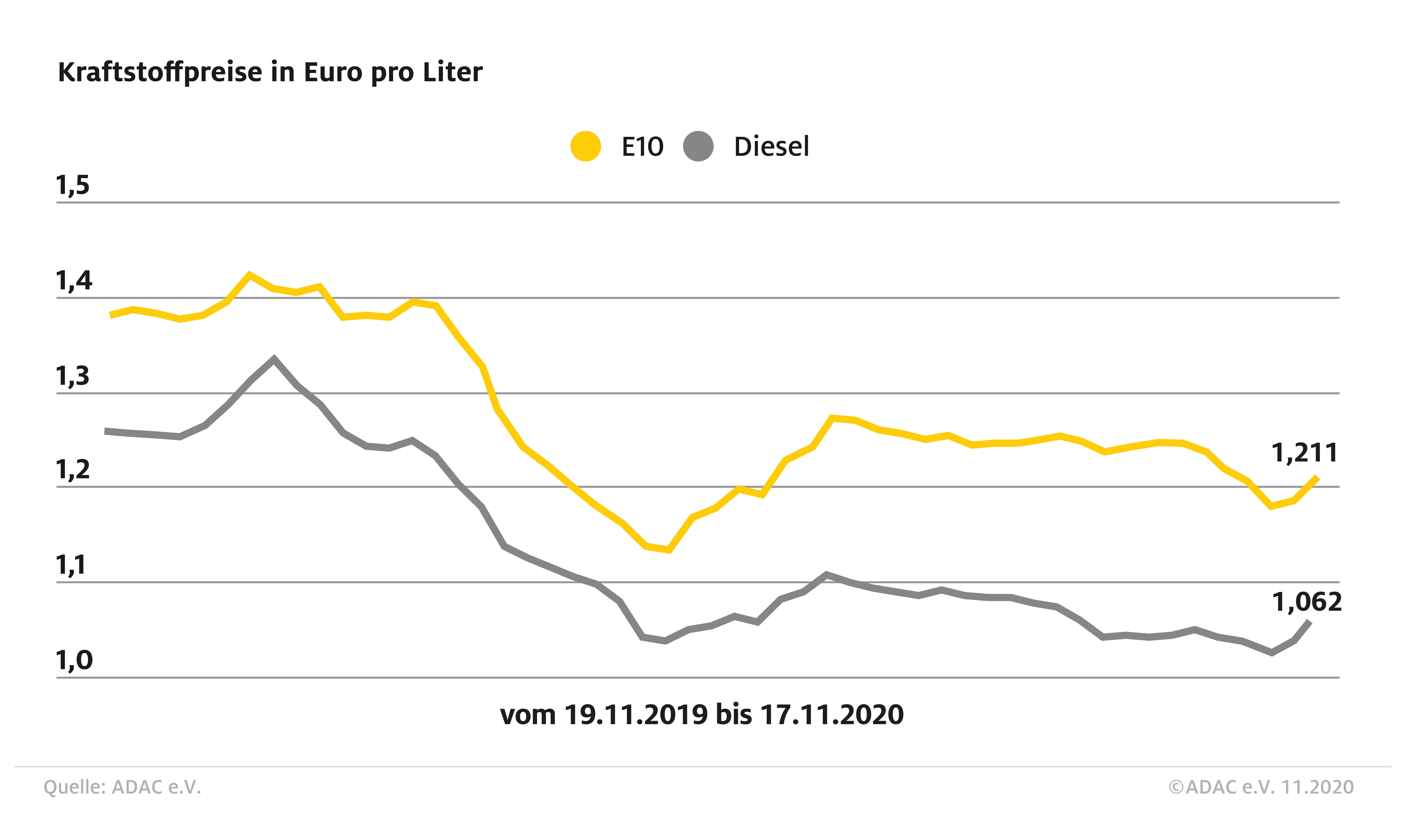 Einen wichtigen Einfluss auf die Entwicklung der Kraftstoffpreise haben die Rohölnotierungen. Rund zwei Wochen nach der US-Präsidentschaftswahl und dem damit verbundenem Ergebnis haben die Erwartungen der Marktteilnehmer zu einem erhöhten Ölpreisniveau geführt. Der Preis für ein Barrel der Sorte Brent liegt bei rund 44 Dollar. Ein Euro entspricht aktuell rund 1,18 Dollar.