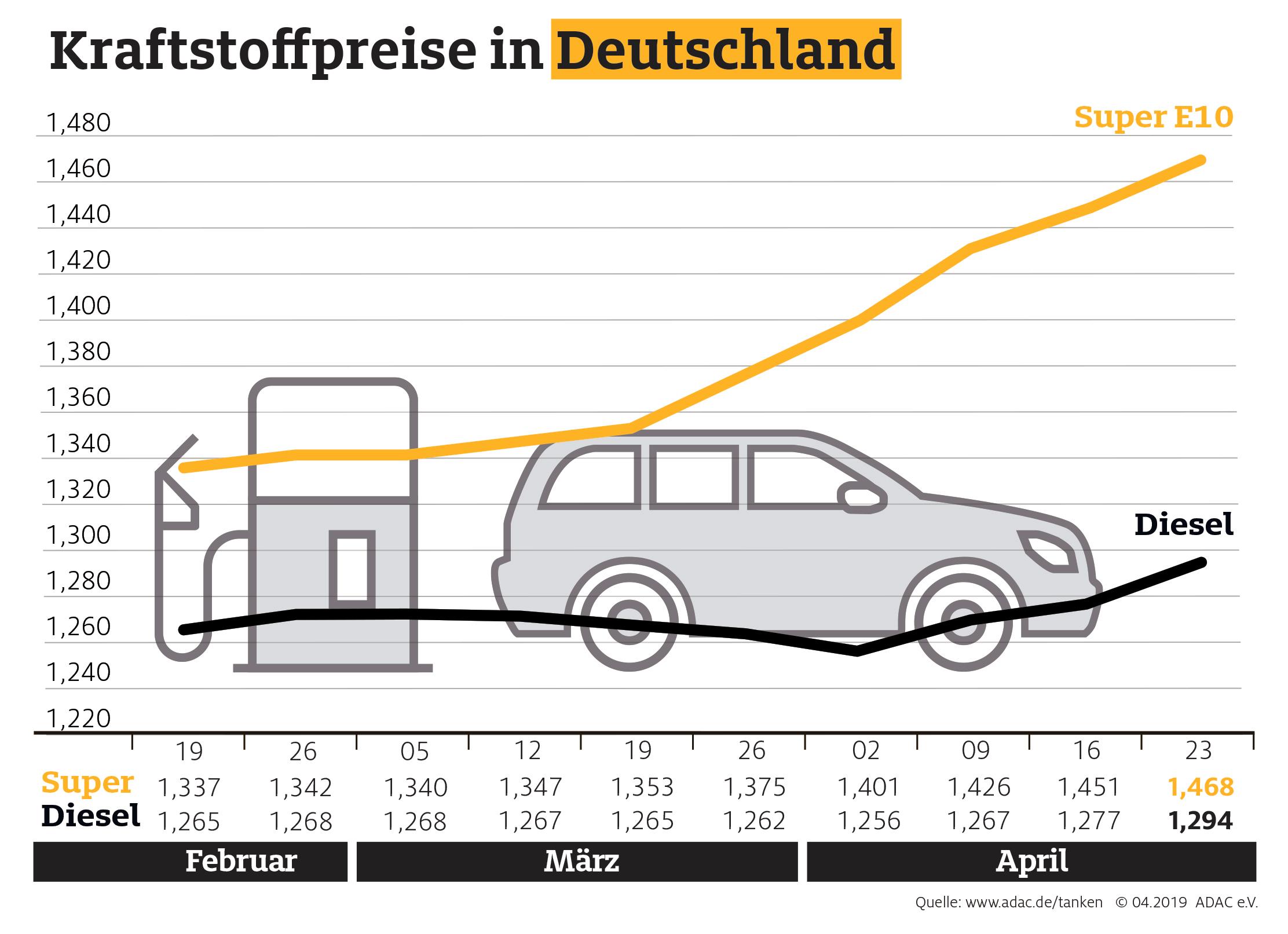 Seit Wochen kennen die Durchschnittspreise für Benzin und Diesel nur eine Richtung: nach oben. Diese Entwicklung setzt sich fort. Laut aktueller Auswertung des ADAC verteuerte sich ein Liter Super E10 im Bundesdurchschnitt um 1,7 Cent auf 1,468 Euro, für einen Liter Diesel müssen Autofahrer im Mittel 1,294 Euro bezahlen, ebenfalls 1,7 Cent mehr als in der Vorwoche. Damit ist der Benzinpreis seit seinem Jahresstiefststand Ende Januar um mehr als 16 Cent gestiegen.