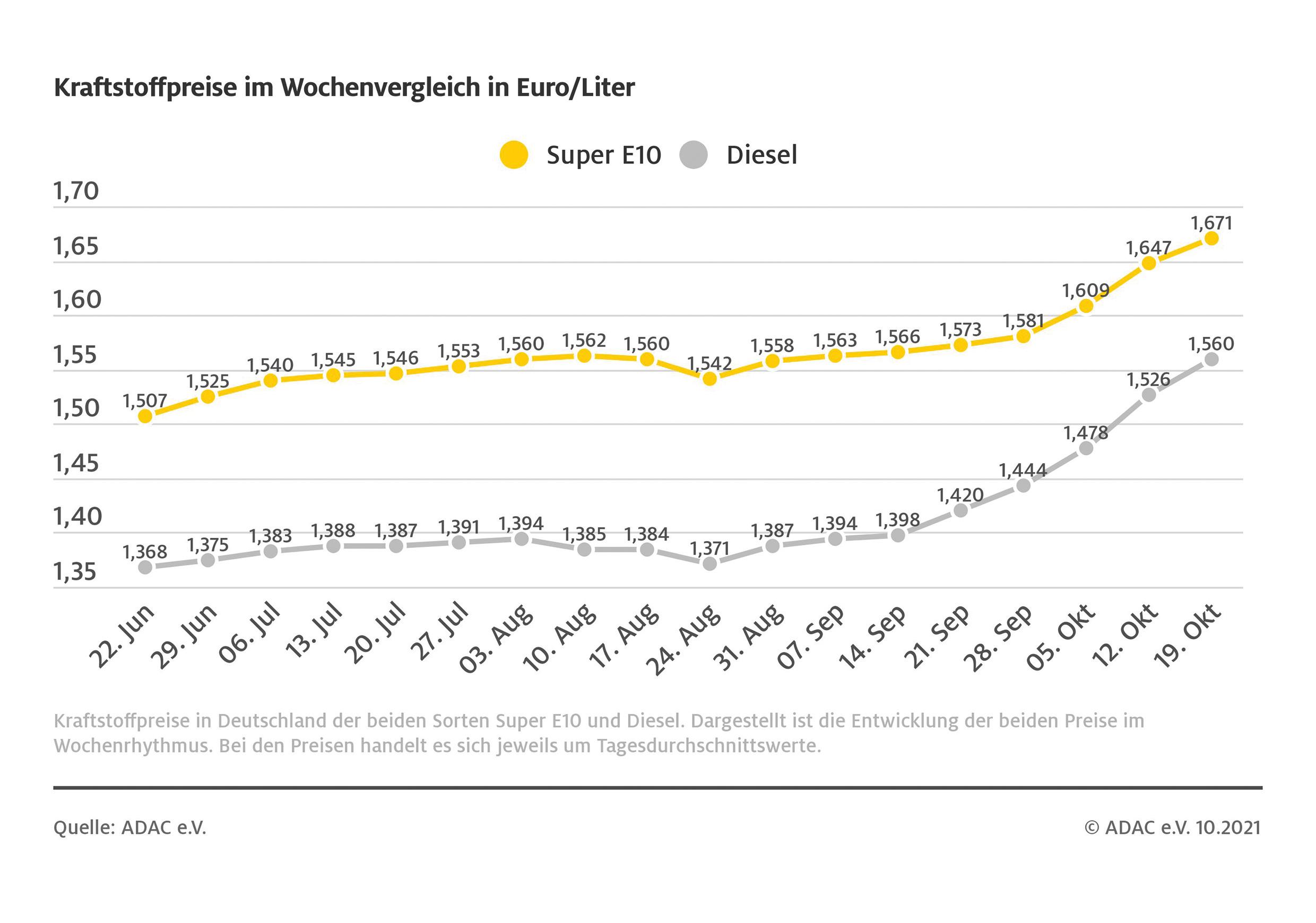 München (ots) – Die Spritpreise steigen weiter. Das ergibt eine aktuelle Auswertung des ADAC. Beim Diesel müssen Verbraucher sich wieder auf ein neues Allzeithoch an den Zapfsäulen einstellen: Im Bundesschnitt werden hier für einen Liter 1,560 Euro fällig – ein Anstieg von 3,4 Cent im Vergleich zur Vorwoche. Für einen Liter Super E10 ermittelt der Club in seinem Wochenvergleich einen bundesweiten Durchschnittspreis von 1,671 Euro. Das entspricht einem Anstieg von 2,4 Cent im Vergleich zur Vorwoche.