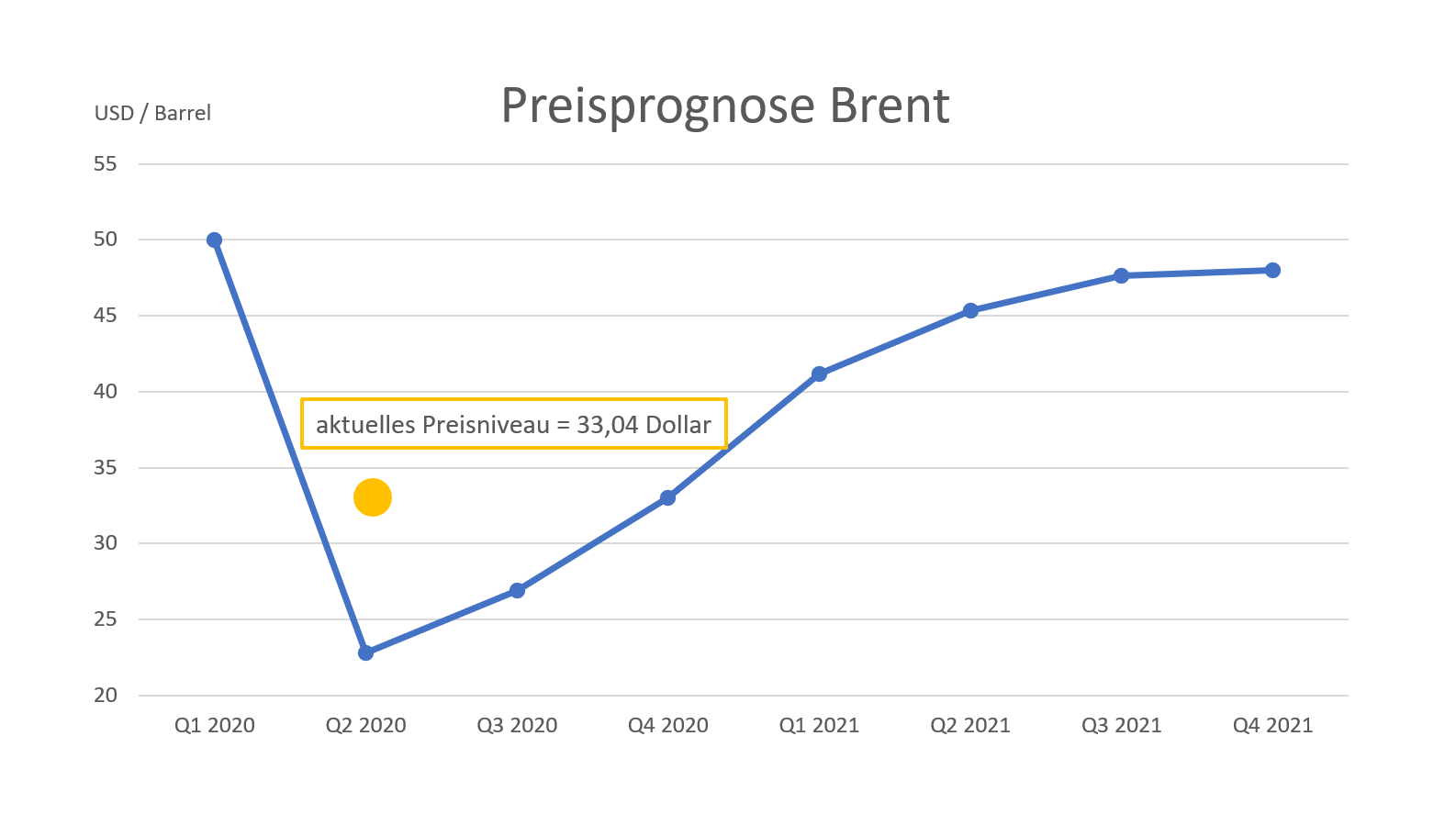 Doch mit einem starken Preisanstieg rechnet das US Energieministerium deshalb nicht. Zu stark sind die Nachfrageausfälle auf globaler Ebene, als dass die sinkende Ölproduktion der USA die Ölpreise nachhaltig stützen könnte. Vielmehr rechnet man damit, dass die europäische Rohölsorte Brent im Jahresdurchschnitt 33,04 Dollar pro Barrel kosten wird, was nur geringfügig über dem aktuellen Niveau von 32,33 Dollar liegt.