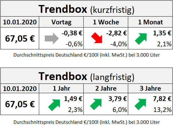 Hinweis: Die genannten Heizölpreise beziehen sich stets auf den deutschlandweiten Durchschnittspreis bei einer Bestellung von 3.000 Liter Heizöl Standard schwefelarm inklusive 19% MwSt.. Durch Transportkosten fallen die Preise regional jedoch unterschiedlich aus. Die Preisspanne zwischen den Regionen kann daher momentan bei bis zu ca. 2,50 Euro pro 100 Liter liegen. Stand der Preise: 10.01.2020