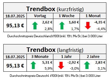 Die genannten Heizölpreise beziehen sich stets auf den deutschlandweiten Durchschnittspreis bei einer Bestellung von 3.000 Liter Heizöl Standard schwefelarm inklusive 19% MwSt. Außerdem fallen durch Transportkosten die Preise regional unterschiedlich aus. Stand der Preise 18.07.2025