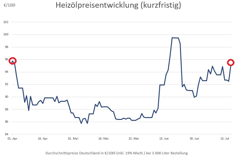 Angesichts der jüngsten Entwicklung haben sich die durchschnittlichen Heizölpreise wieder deutlich von ihrem am 5. Mai bei 85,72 Euro festgestellten bisherigen Jahrestiefpreis entfernt. Die Differenz beträgt (Stand Freitagnachmittag) 9,41 Euro oder 11,0 %. Damit notieren die Heizölpreise wieder auf dem Niveau, mit dem sie ins 2. Quartal dieses Jahres gestartet waren.