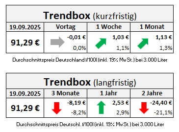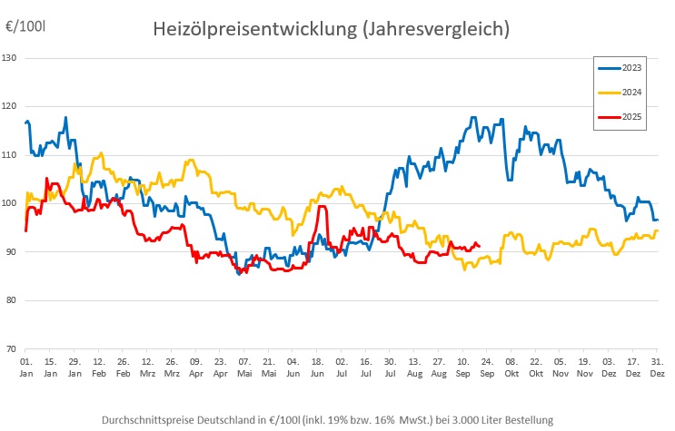 Die genannten Heizölpreise beziehen sich stets auf den deutschlandweiten Durchschnittspreis bei einer Bestellung von 3.000 Liter Heizöl Standard schwefelarm inklusive 19% MwSt. Außerdem fallen durch Transportkosten die Preise regional unterschiedlich aus. Stand der Preise 19.09.2025