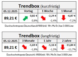 Betrachtet man die langfristigen Preisentwicklungen, war Heizöl Ende letzter Woche im Bundesgebiet durchschnittlich -1,69 Euro günstiger als Anfang September. Im Vergleich zum entsprechenden Zeitpunkt des Jahres 2024, war der Heizölpreis am vergangenen Freitag etwa -1,16 Dollar billiger. Verglichen mit dem 5. Dezember 2023 fiel der Preisrückgang dagegen, mit -11,84 Euro bzw. -11,7 % erneut deutlicher aus.