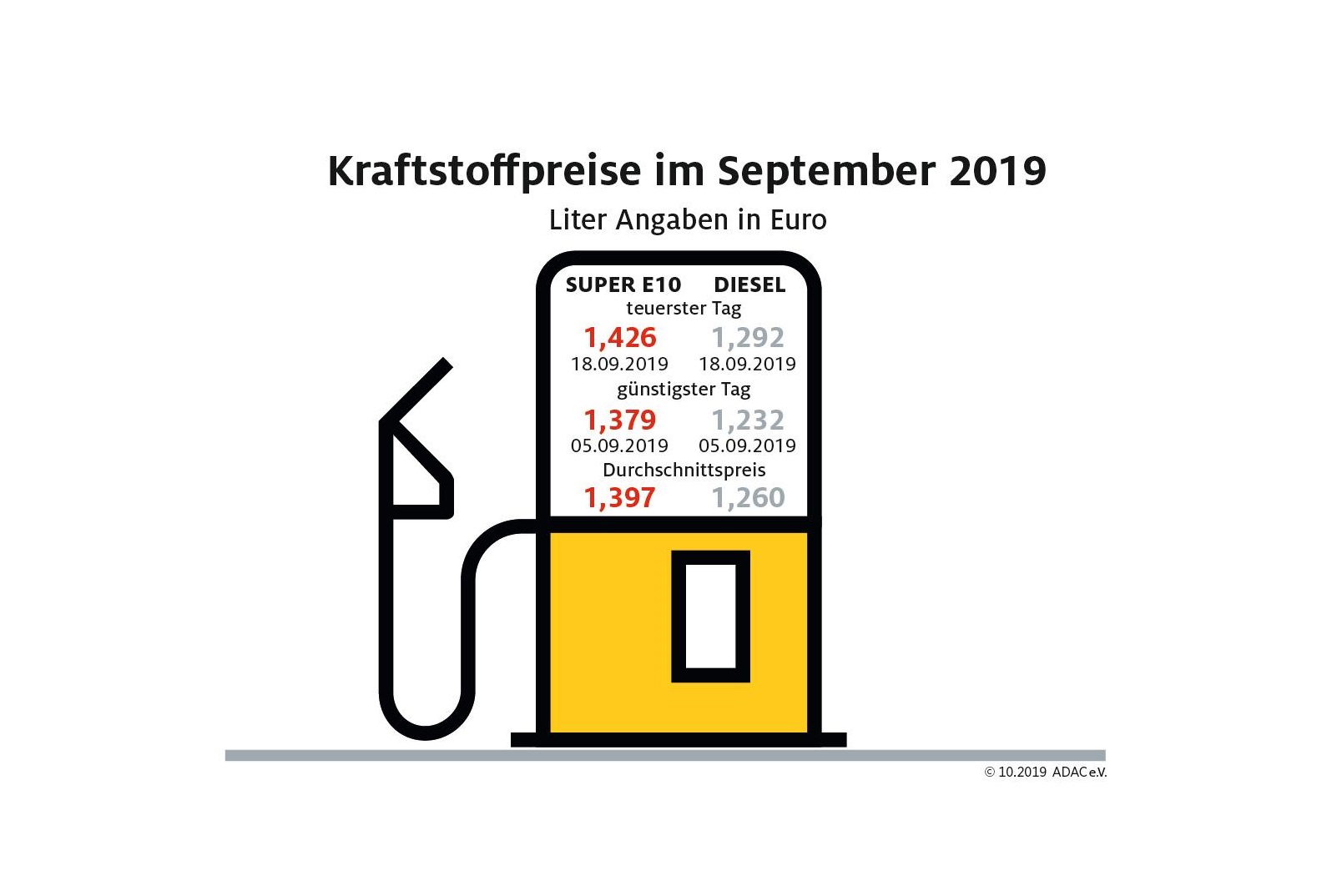 Teuerster Tanktag für beide Sorten war der 18. September. Autofahrer mussten für einen Liter Super E10 an diesem Tag durchschnittlich 1,426 Euro und für einen Liter Diesel 1,292 Euro bezahlen. Am günstigsten war Super E10 (1,379 Euro) bzw. Diesel (1,232 Euro) am 5. September.