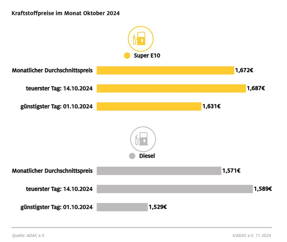 Nach mehreren Monaten rückläufiger Preise mussten die Autofahrerinnen und Autofahrer im Oktober wieder etwas mehr für Sprit bezahlen als im Vormonat. Die aktuelle ADAC Auswertung der Kraftstoffpreise im Oktober zeigt, dass ein Liter Super E10 im Mittel 1,672 Euro kostete.