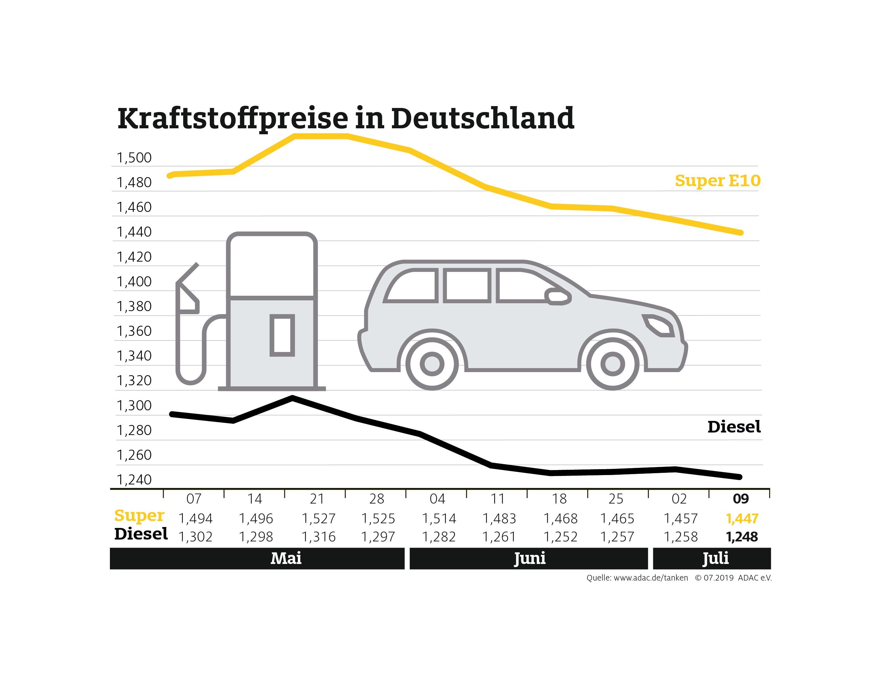 Autofahrer müssen an den Tankstellen für Benzin und Diesel etwas weniger bezahlen als in der Vorwoche. Dies ergibt die aktuelle Auswertung des ADAC. Ein Liter Super E10 verbilligte sich im Bundesdurchschnitt um 1,0 Cent auf 1,447 Euro, Diesel kostete im Mittel 1,248 Euro je Liter, das sind ebenfalls 1,0 Cent weniger als noch vor einer Woche. Der Benzinpreis lag zuletzt Mitte April auf diesem niedrigen Niveau. Diesel war zuletzt Mitte Februar billiger.