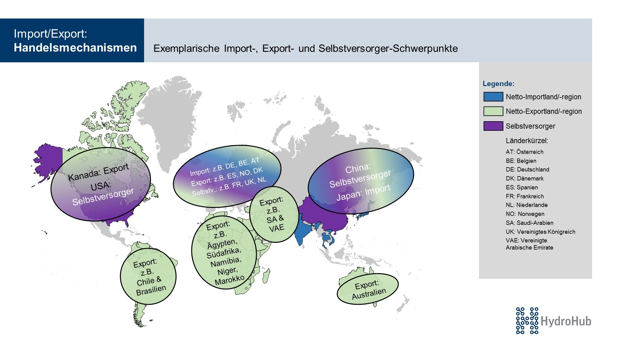 Exemplarische Import-, Export- und Selbstversorger-Schwerpunkte für Wasserstoff weltweit.